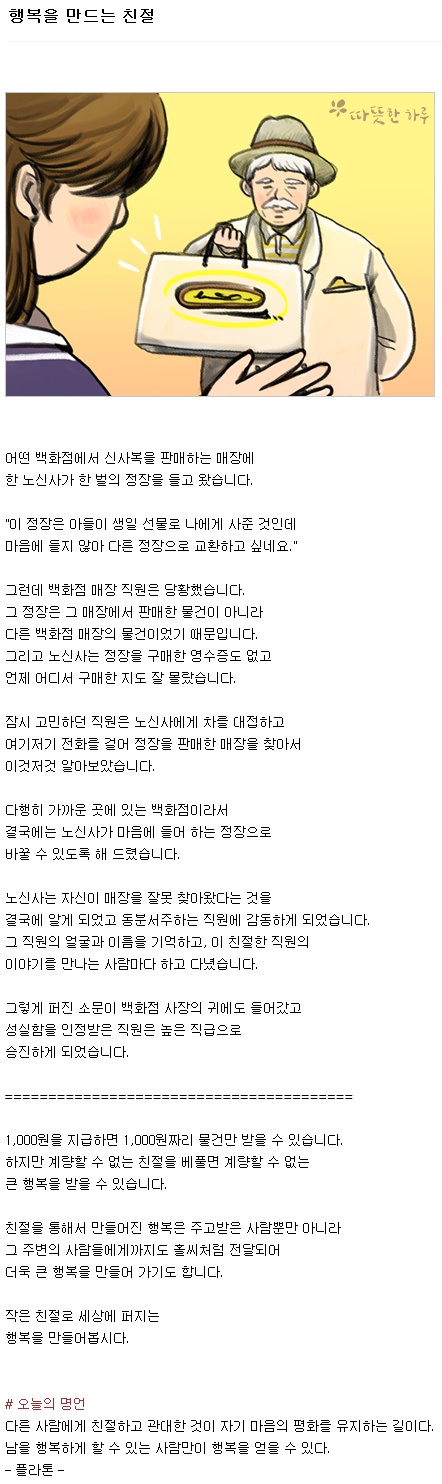 행복을 만드는 친절 페이지 정보 작성자 양승열집사 작성일19-07-19 00:17 조회1,874회 댓글0건 관련링크 목록 본문 출처 : 따뜻한 하루 댓글목록 등록된 댓글이 없습니다. 목록